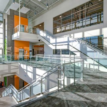 PROJECT PROFILE: Westfield High School GC/CM: Gibraltar Construction ARCHITECT: CSO Architects MANUFACTURER: Livers Bronze Railing SCOPE: 313 LF of Belmont System with metal mesh infill